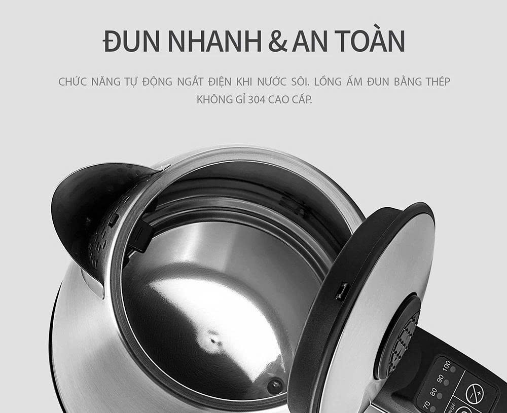 – Chức năng tự động ngắt điện khi nước sôi, lồng ấm đun bằng thép không gỉ 304
