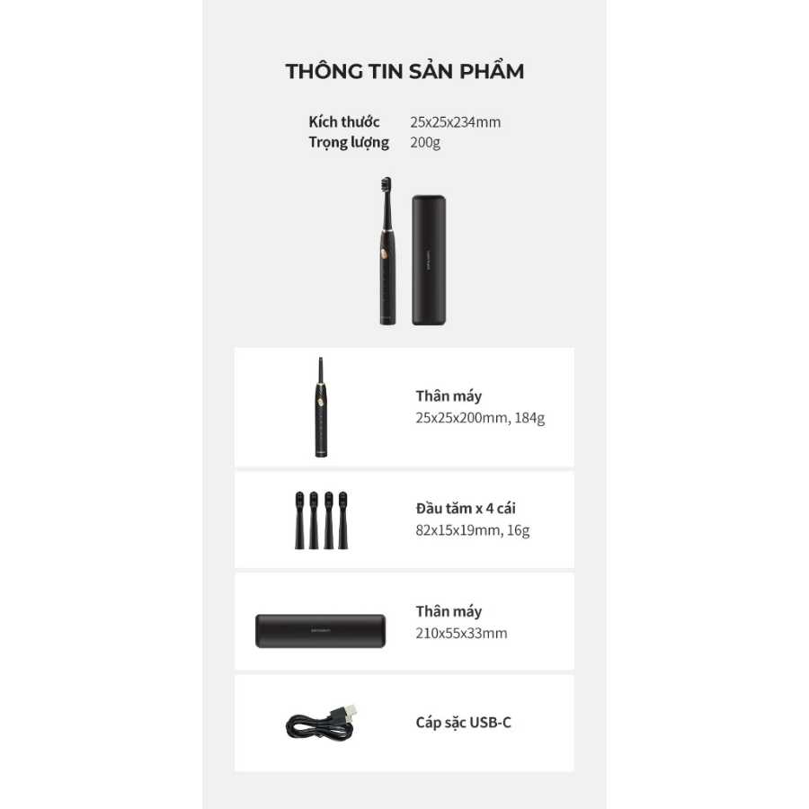 Bộ sản phẩm bao gồm: 01 thân bàn chải, 04 đầu bàn chải, 01 cáp sạc, 01 hộp đựng