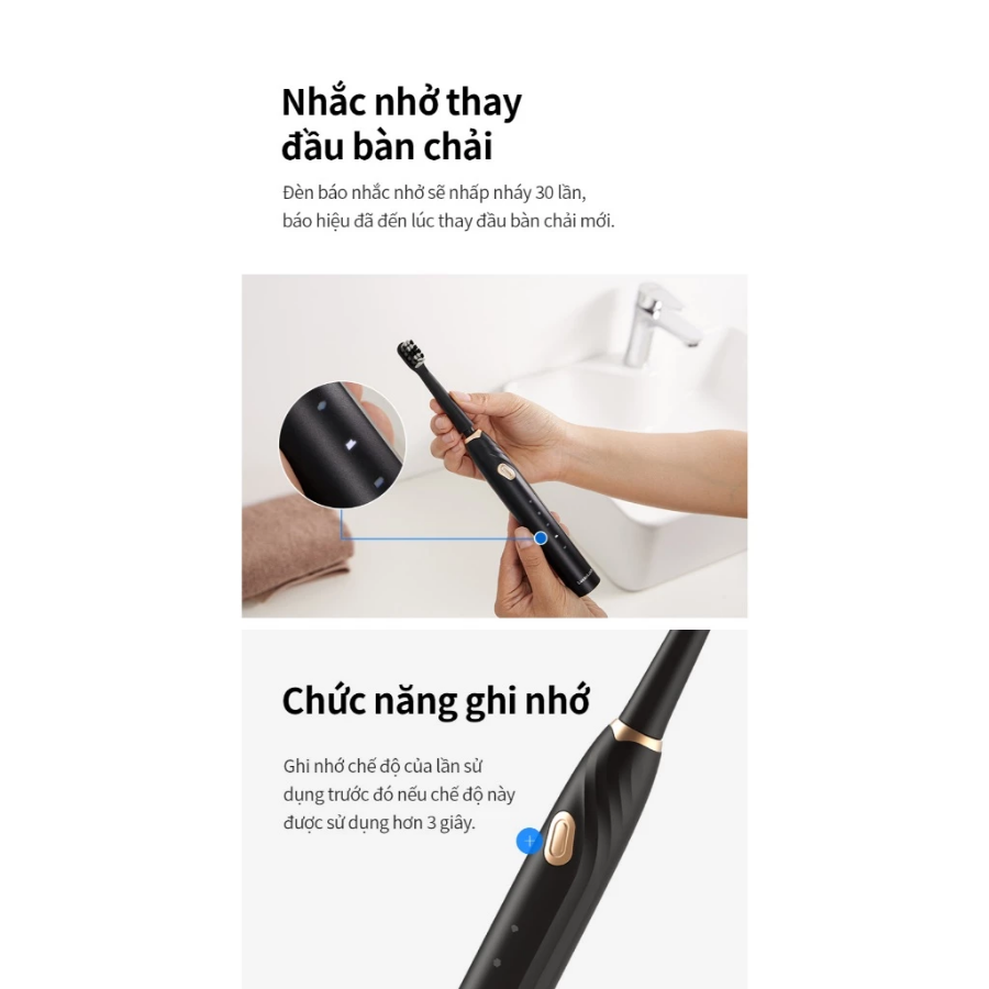 – NHẮC NHỞ THAY ĐẦU BÀN CHẢI: Đèn báo nhắc nhở sẽ nhấp nháy 30 lần, báo hiệu đã đến lúc thay đầu bàn chải mới.