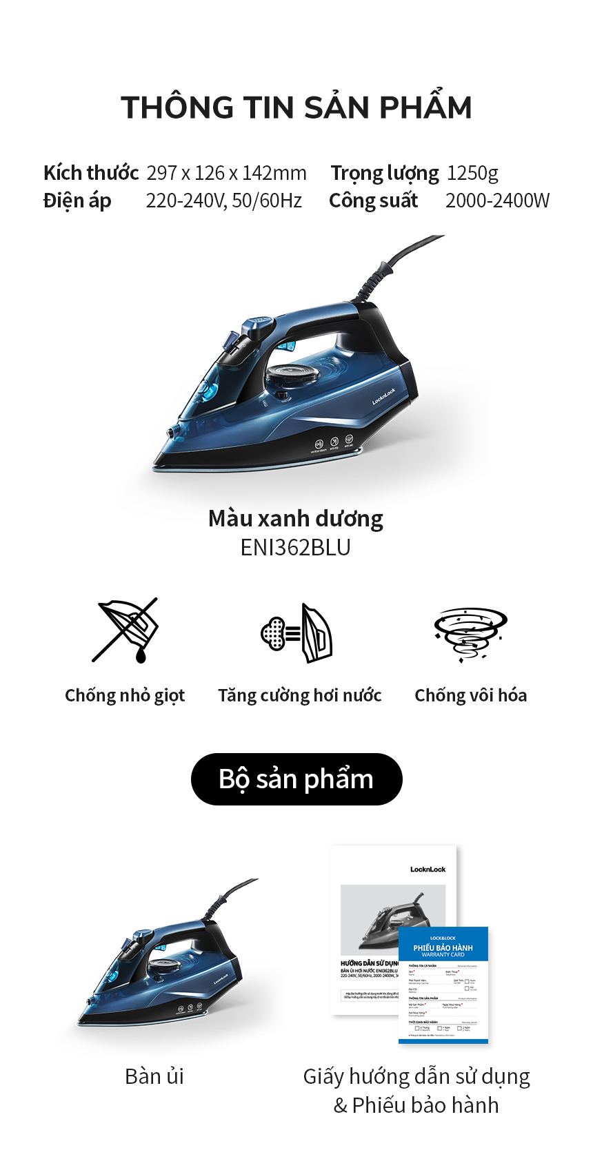 Khi bạn tìm kiếm một chiếc bàn ủi đáng tin cậy và hiệu quả, bàn ủi hơi nước LocknLock ENI362BLU 340ml nổi bật không chỉ nhờ thiết kế màu xanh dương bắt mắt mà còn bởi những tính năng vượt trội giúp làm phẳng quần áo một cách dễ dàng và nhanh chóng.