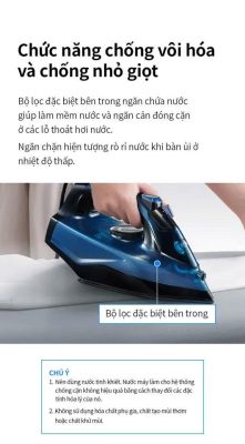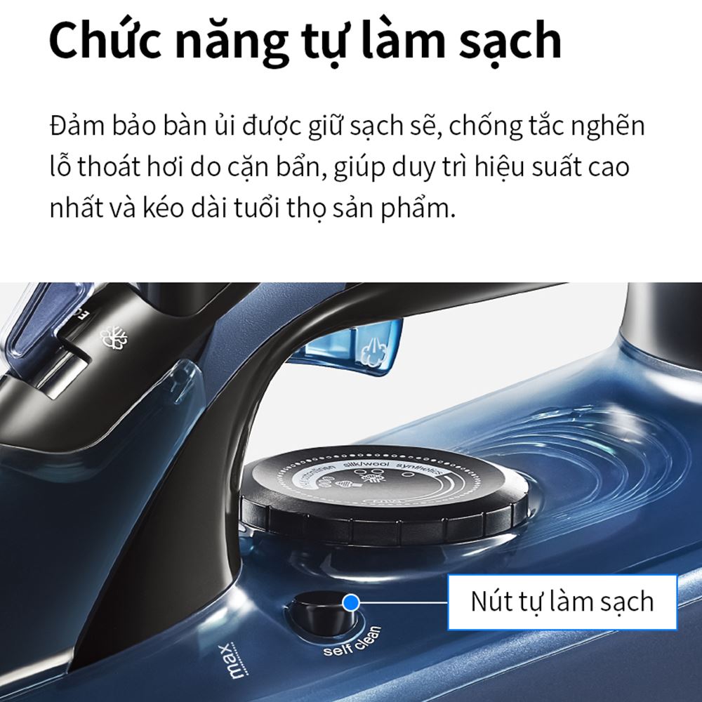 Một trong những đặc điểm nổi bật của bàn ủi này là chức năng tự làm sạch. Bàn ủi sẽ tự động loại bỏ cặn bẩn và canxi tích tụ bên trong, đảm bảo hiệu suất làm việc luôn ở mức cao và kéo dài tuổi thọ của sản phẩm. Chống vôi hóa giúp ngăn ngừa sự tích tụ cặn trong bể chứa nước, là điều cần thiết đối với vùng nước cứng.