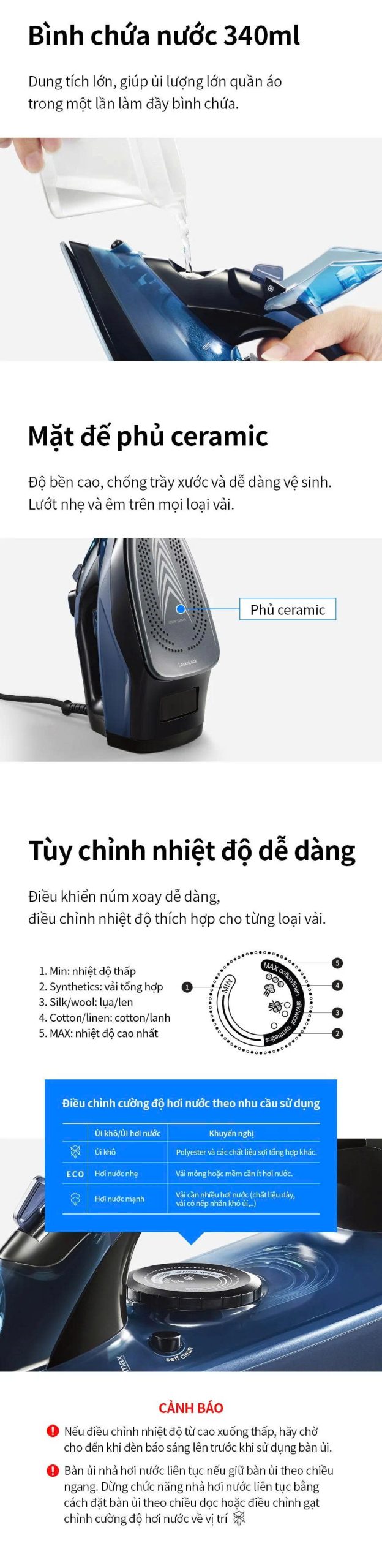 Chiếc bàn ủi này được thiết kế với mũi nhọn, tối ưu cho việc tiếp cận những khu vực khó ủi như cổ áo, quanh nút áo, hoặc mép quần. Với dây điện xoay 360 độ, bạn có thể di chuyển bàn ủi dễ dàng mà không lo bị vướng. Vỏ ngoài được làm từ nhựa PP và PC, trong khi đế ủi làm từ gốm sứ, giúp trượt êm ái trên nhiều loại vải khác nhau mà không gây hư hại.