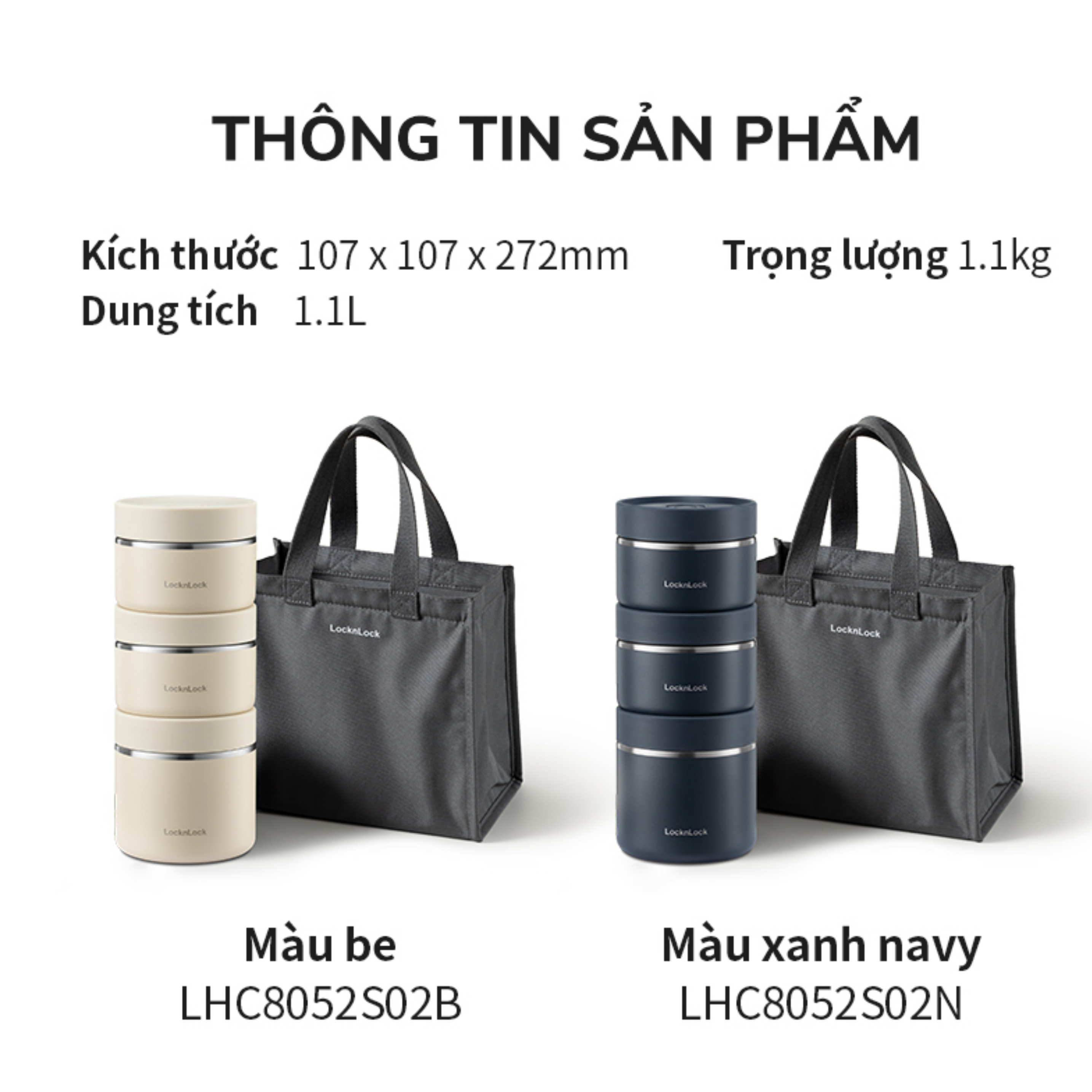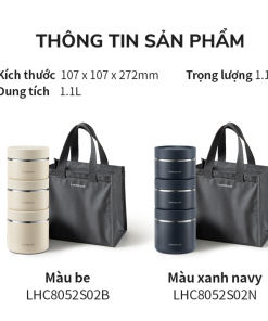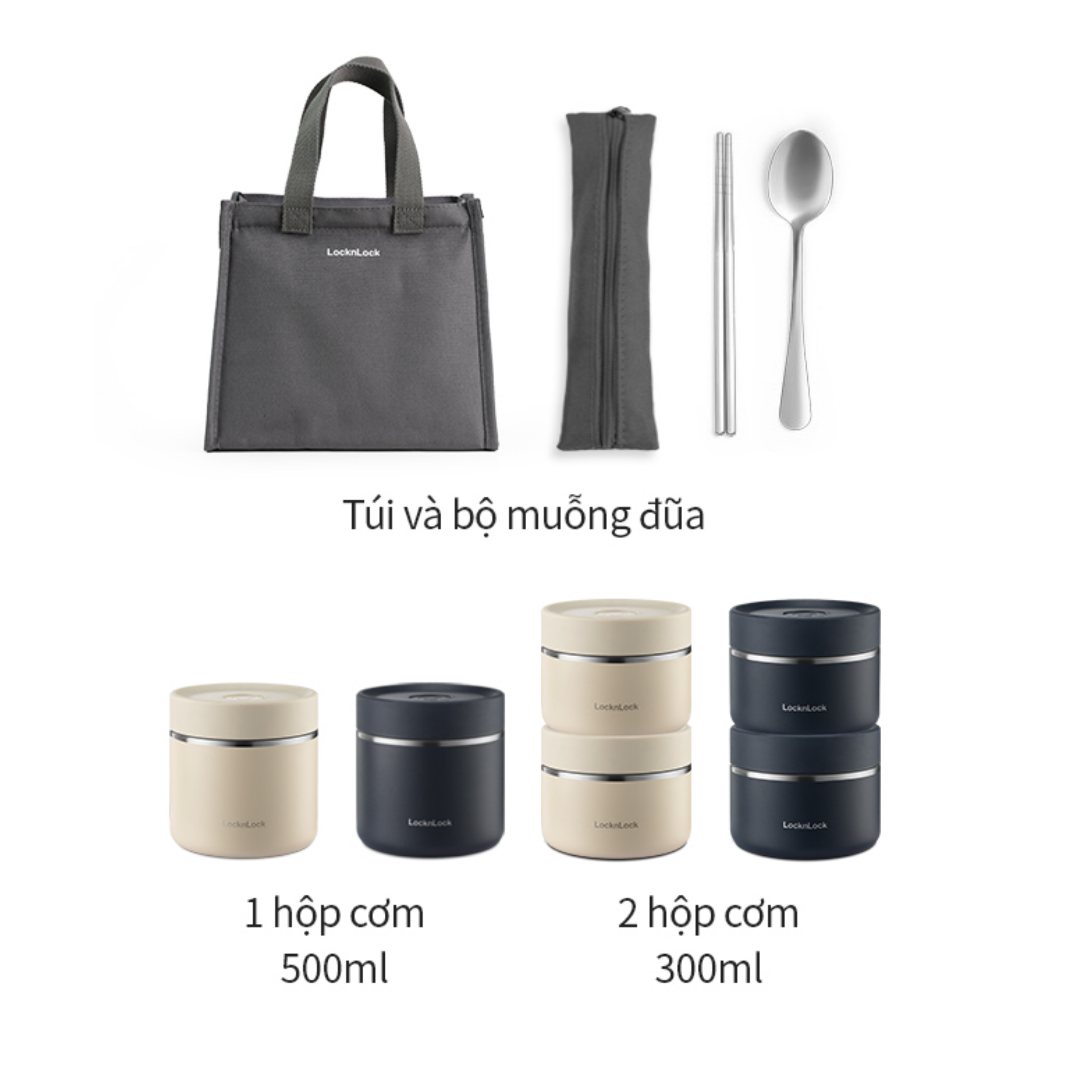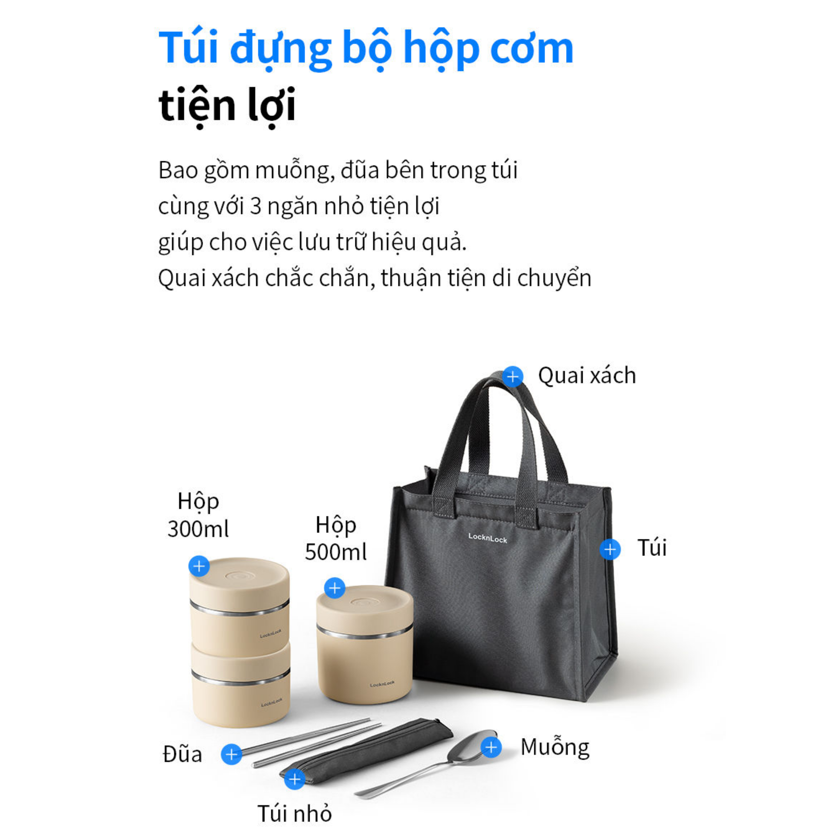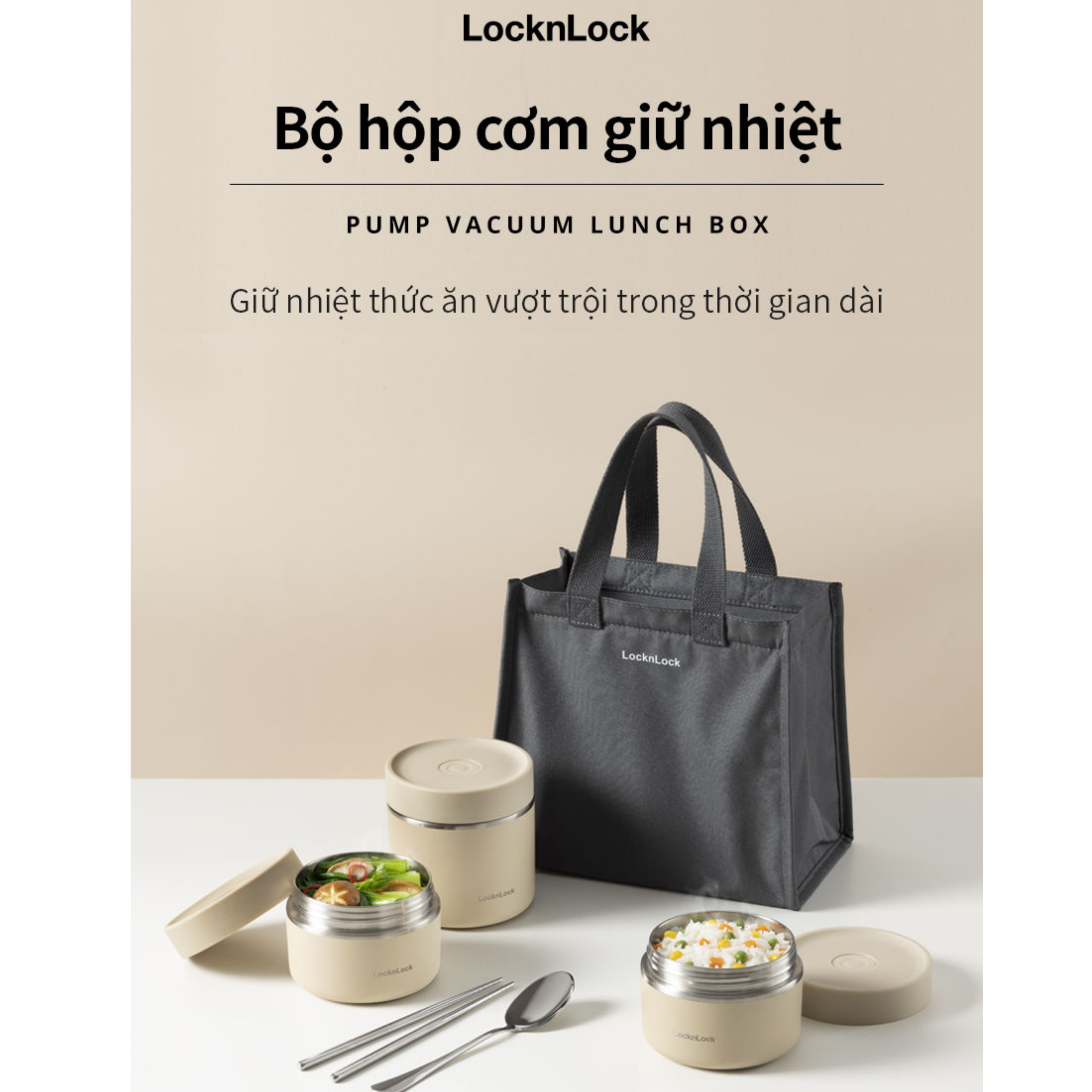 Bộ hộp cơm giữ nhiệt Lock&Lock Pump Vacuum Lunch Box (300ml*2, 500ml*1, bộ đũa và thìa, túi) LHC8052S02