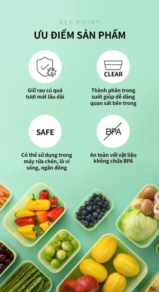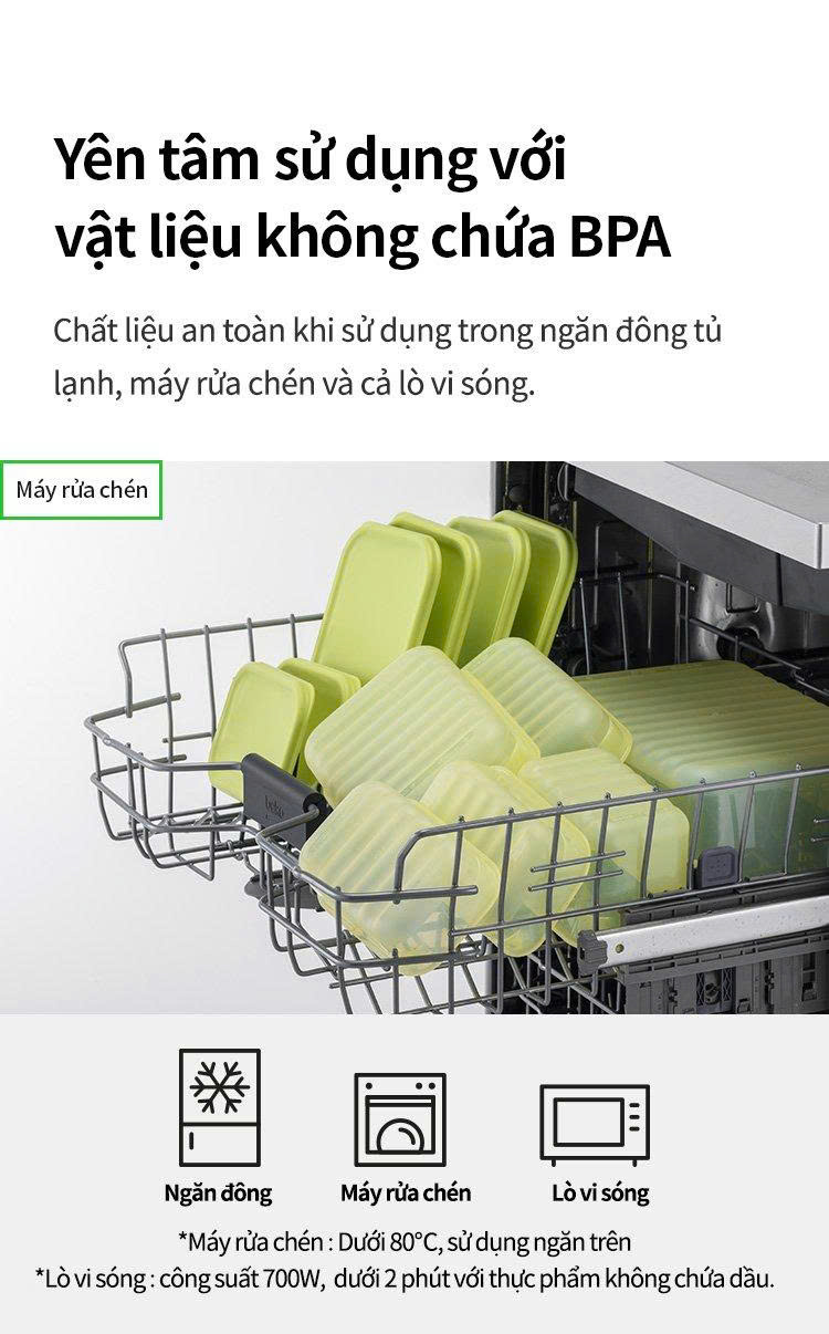 • Chất liệu: Nhựa PP, Không BPA, An toàn tẩy rửa, Bảo quản lạnh an toàn, An toàn sử dụng lò vi sóng, Có thể xếp chồng.
