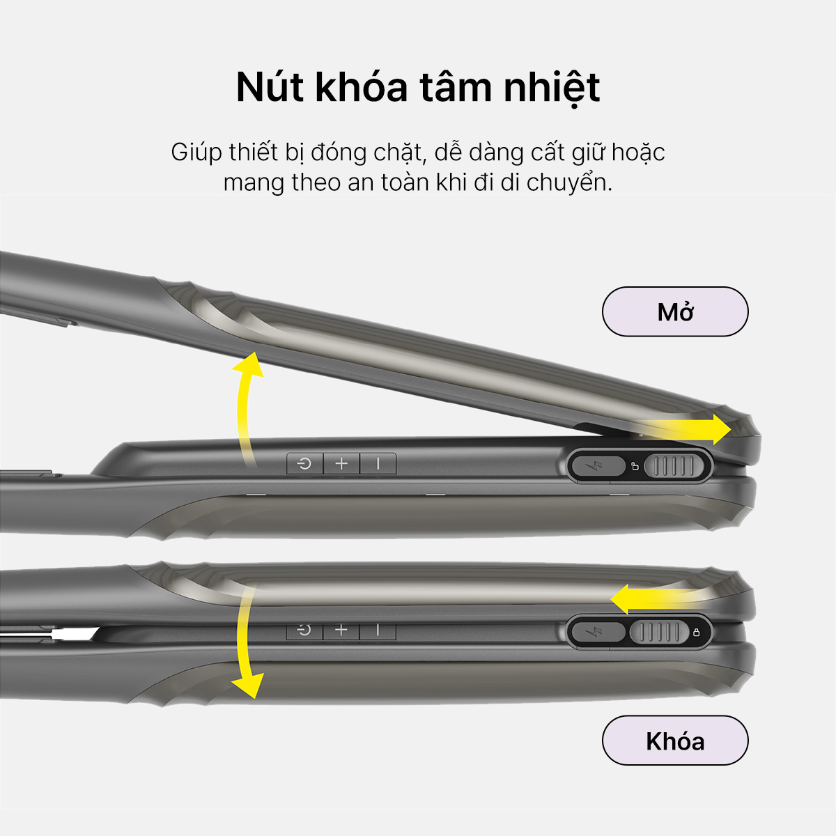 – NÚT KHÓA TẤM NHIỆT: Giúp thiết bị đóng chặt, dễ dàng cất giữ hoặc mang theo an toàn khi đi di chuyển.