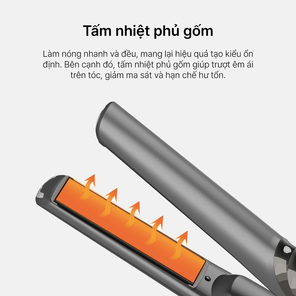 – TẤM NHIỆT PHỦ GỐM: Làm nóng nhanh và đều, mang lại hiệu quả tạo kiểu ổn định. Bên cạnh đó, tấm nhiệt phủ gốm giúp trượt êm ái trên tóc, giảm ma sát và hạn chế hư tổn