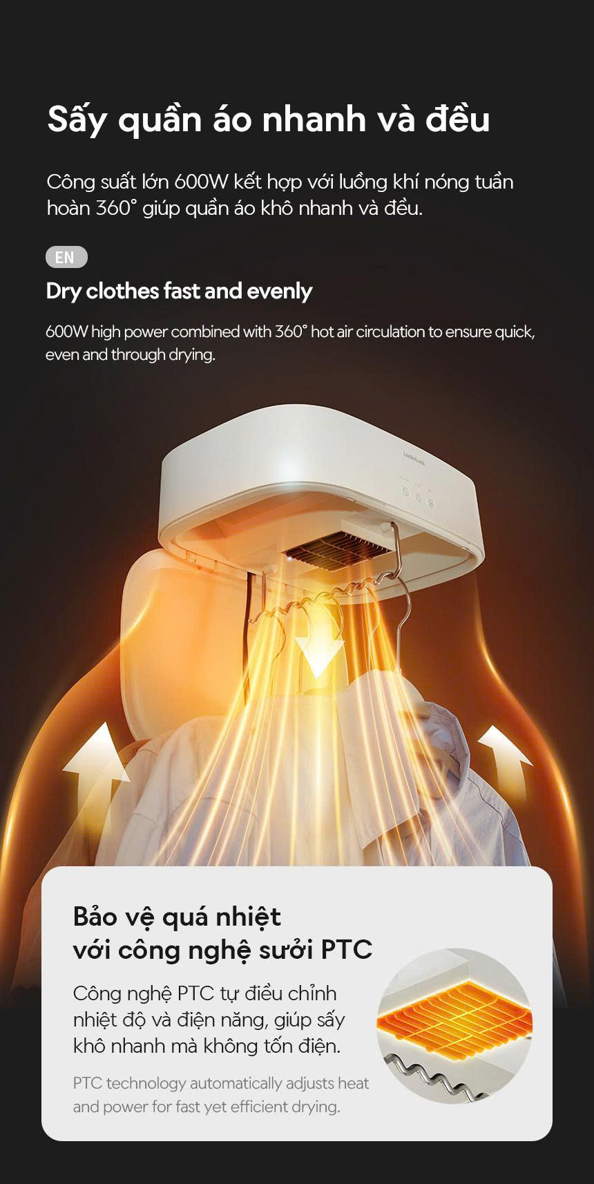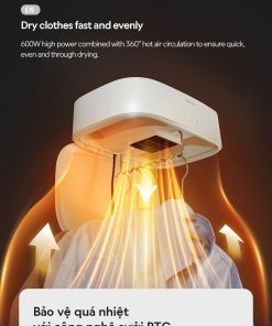 – MẠNH MẼ VÀ NHANH CHÓNG: Công suất lớn 600W kết hợp với luồng khí nóng tuần hoàn 360° giúp quần áo khô nhanh và đều