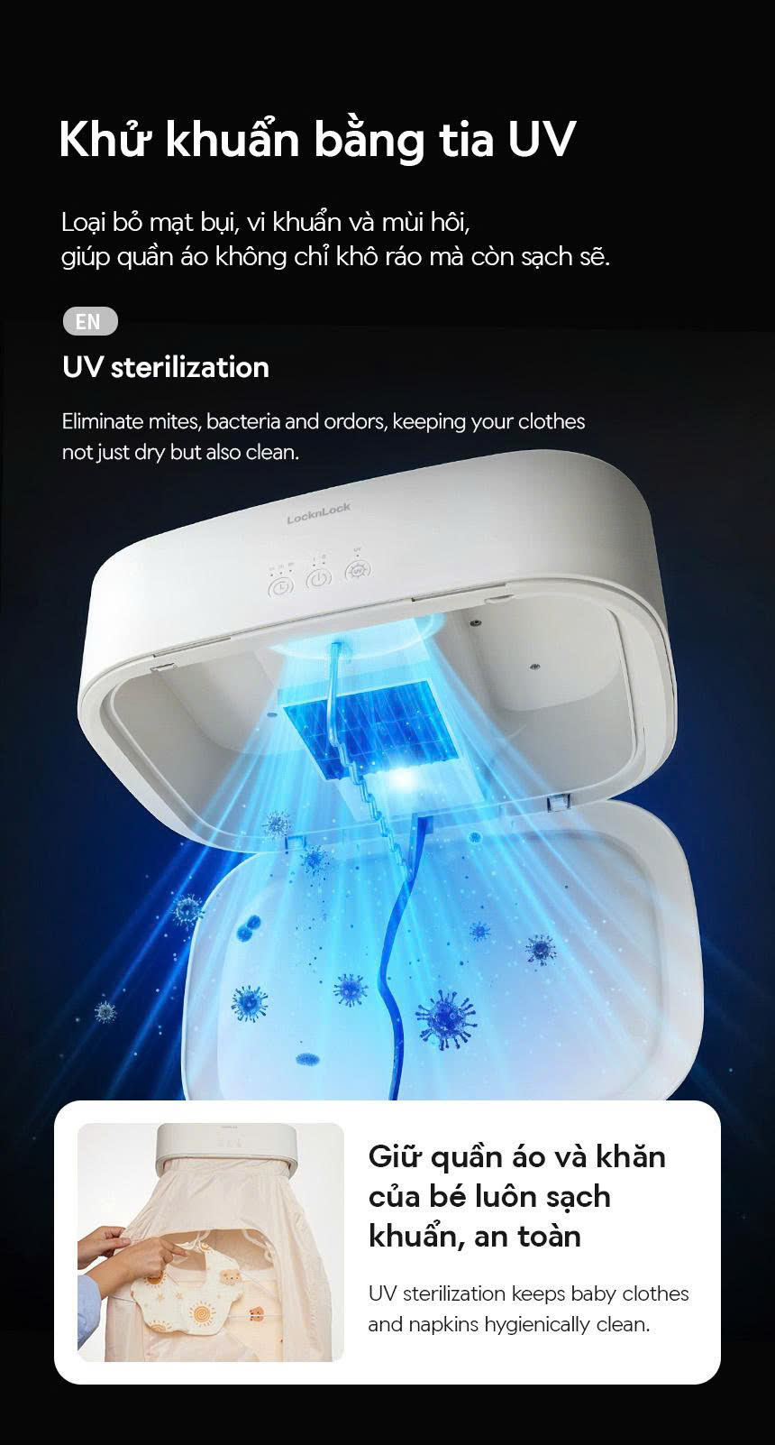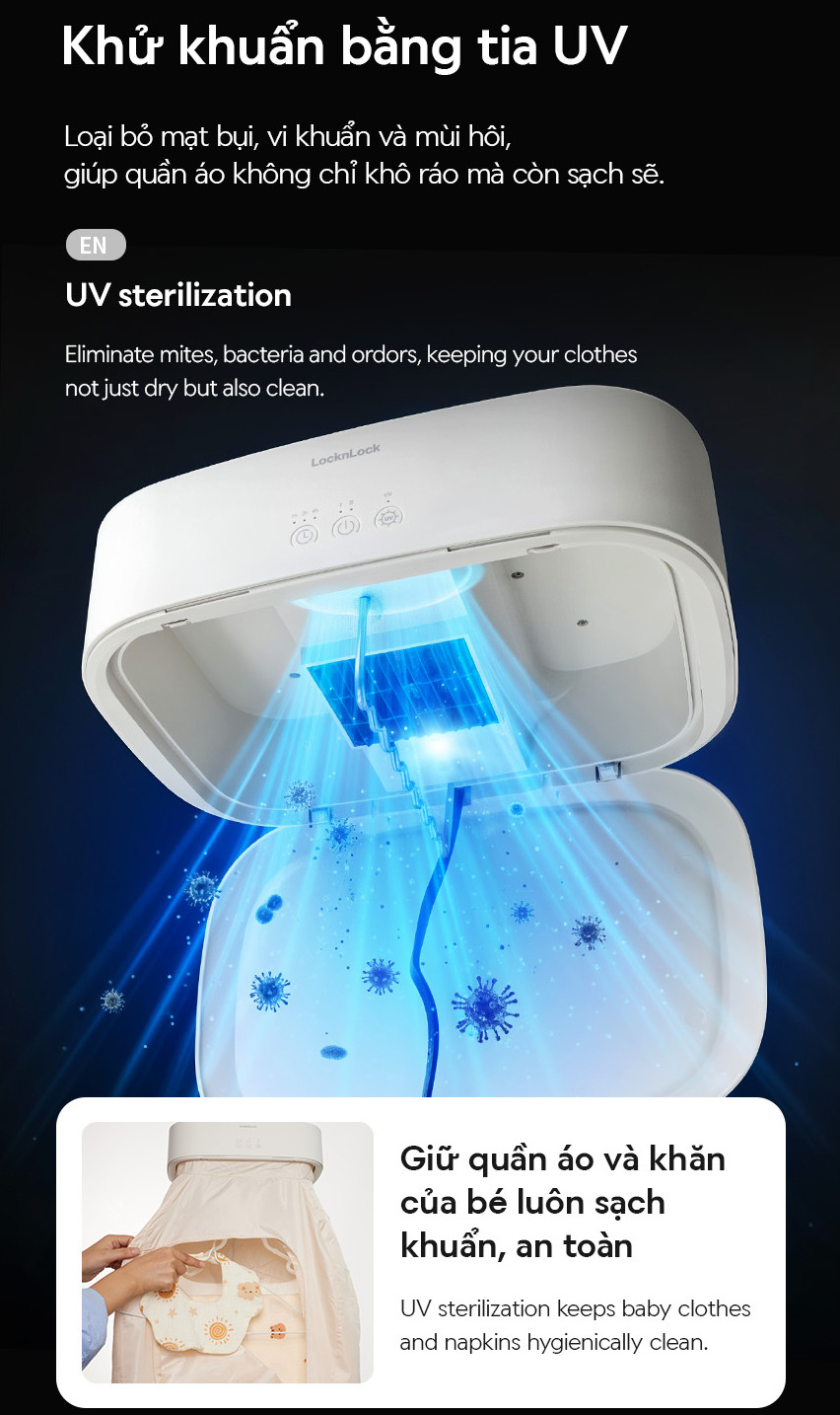 – KHỬ KHUẨN BẰNG TIA UV: Loại bỏ mạt bụi, vi khuẩn và mùi hôi, giúp quần áo không chỉ khô ráo mà còn sạch sẽ.