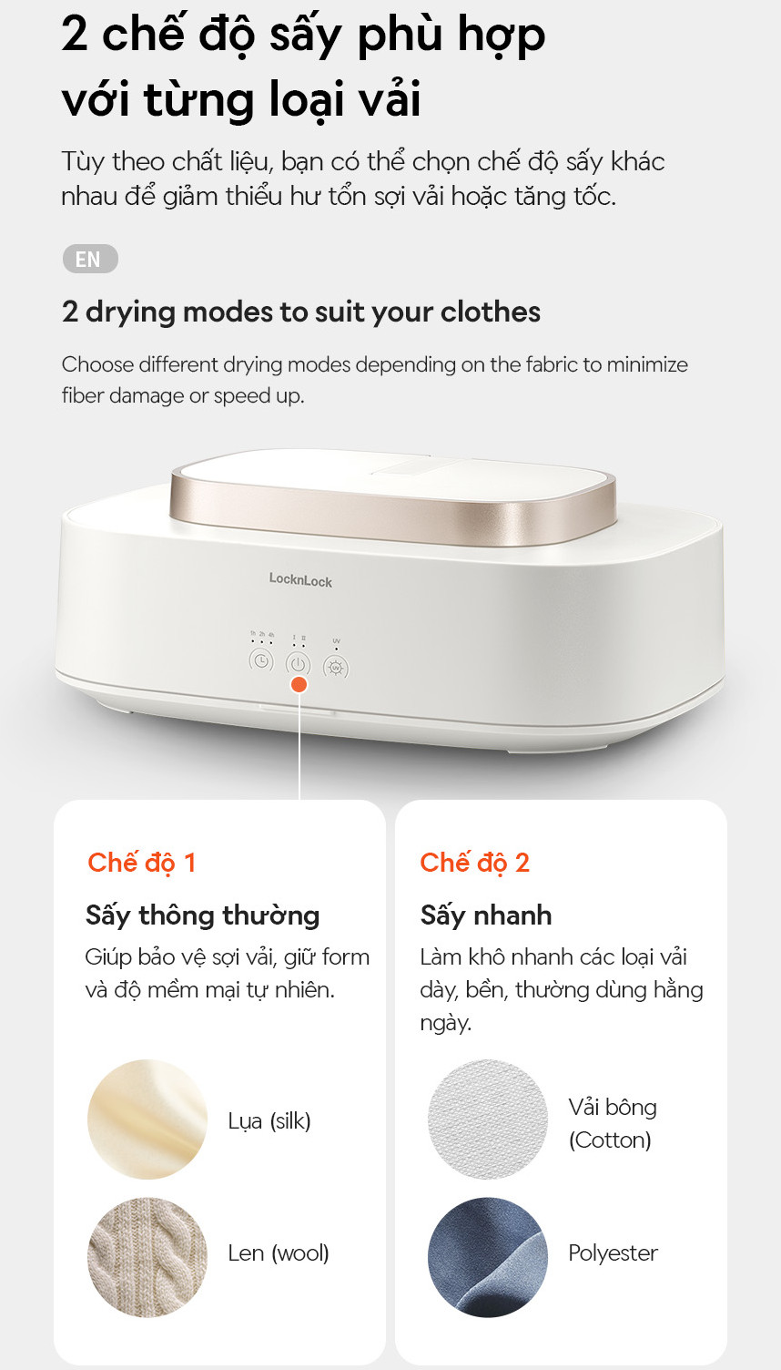 – 2 CHẾ ĐỘ SẤY: Lựa chọn chế độ nhiệt cao để sấy nhanh hoặc nhiệt thấp để bảo vệ vải mỏng nhẹ.