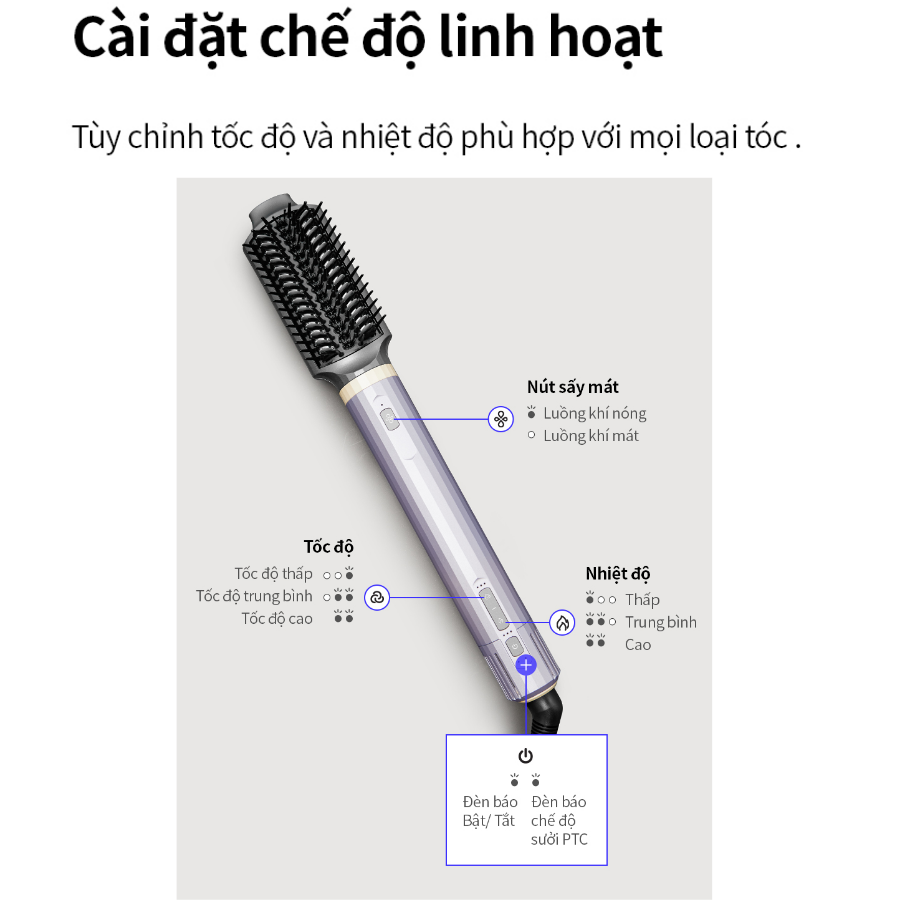 CÀI ĐẶT CHẾ ĐỘ LINH HOẠT: Tùy chỉnh tốc độ và nhiệt độ phù hợp với mọi loại tóc và kiểu tóc mong muốn