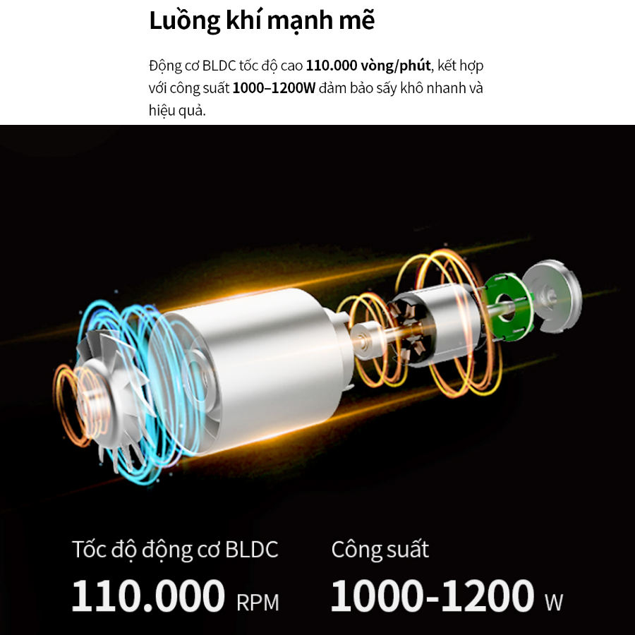 LUỒNG KHÍ MẠNH MẼ: Động cơ BLDC tốc độ cao 110.000 vòng/phút, kết hợp với công suất 1000–1200W đảm bảo sấy khô nhanh và hiệu quả