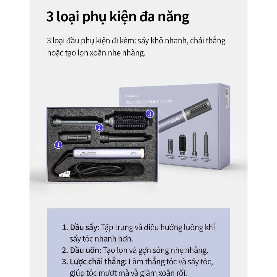 ĐA NĂNG: Bao gồm 3 loại đầu phụ kiện đi kèm cho sấy khô nhanh, chải thẳng hoặc tạo lọn xoăn nhẹ nhàng—phù hợp cho mọi thói quen chăm sóc tóc