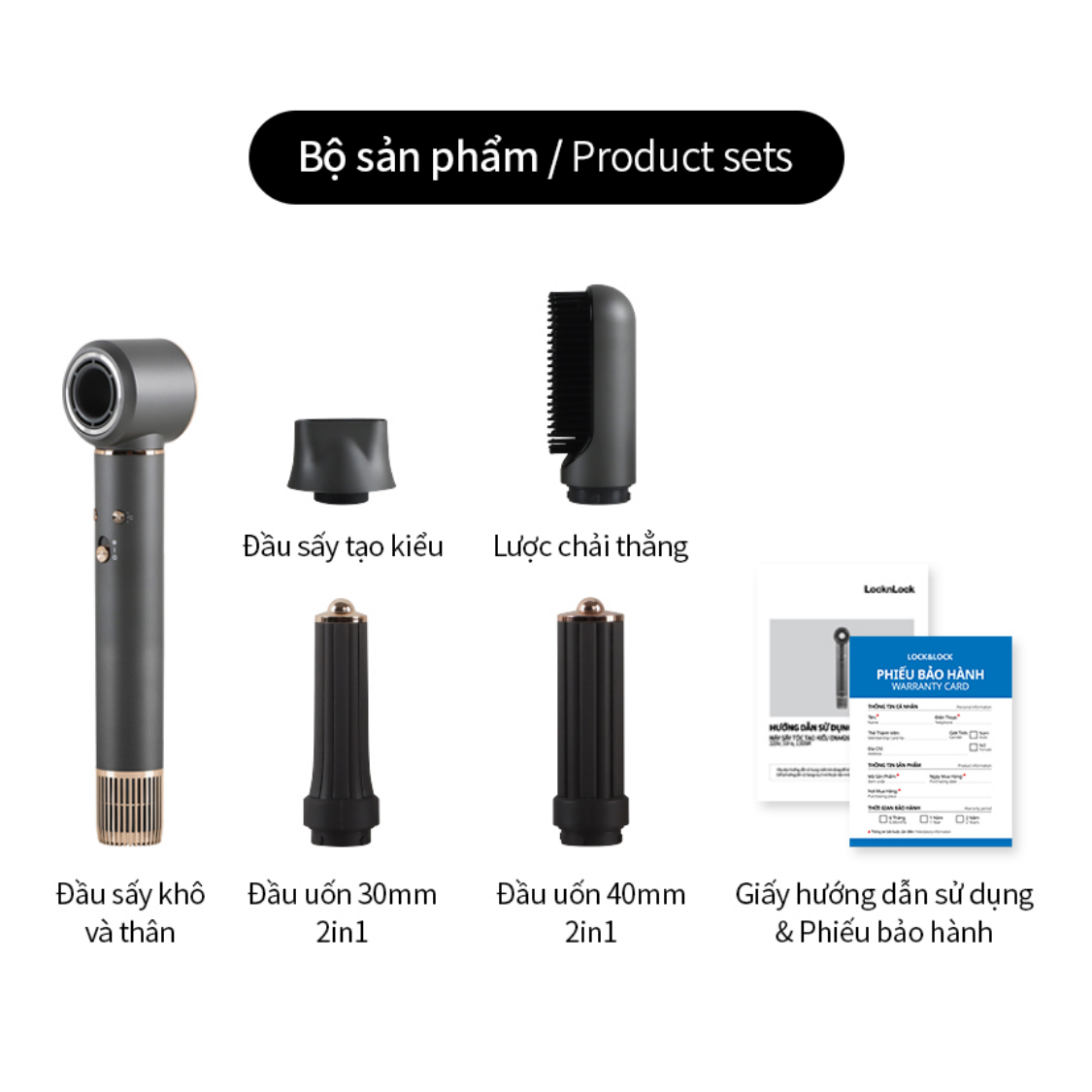 Máy sấy tóc tạo kiểu LocknLock Multi Hair Dryer công nghệ ION âm 5 loại đầu sấy màu xám ENA426GRY