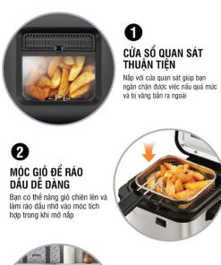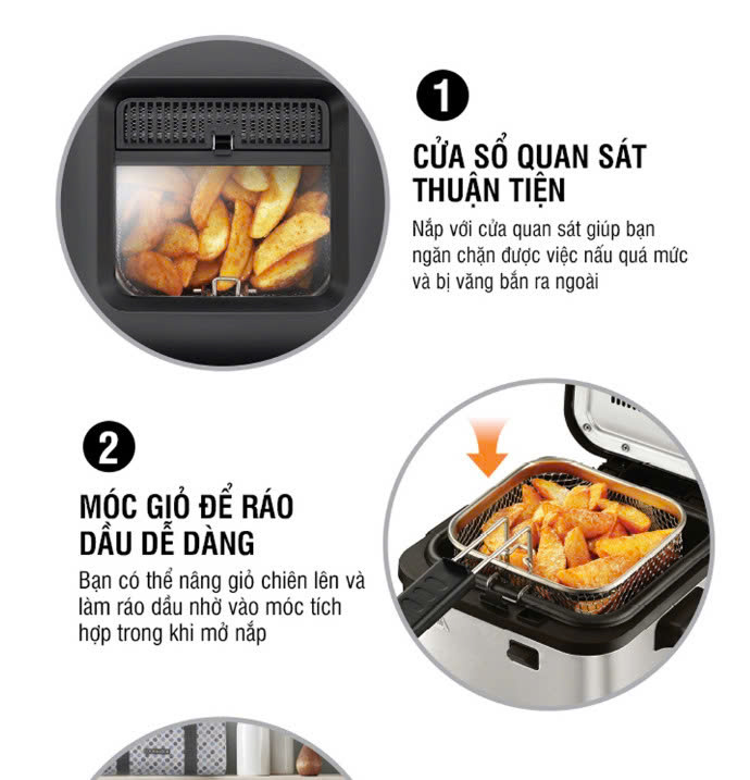 - Móc giỏ tiện lợi: Giỏ chiên tích hợp móc treo để bạn nâng thực phẩm lên và để ráo dầu ngay trên nồi sau khi chiên xong.