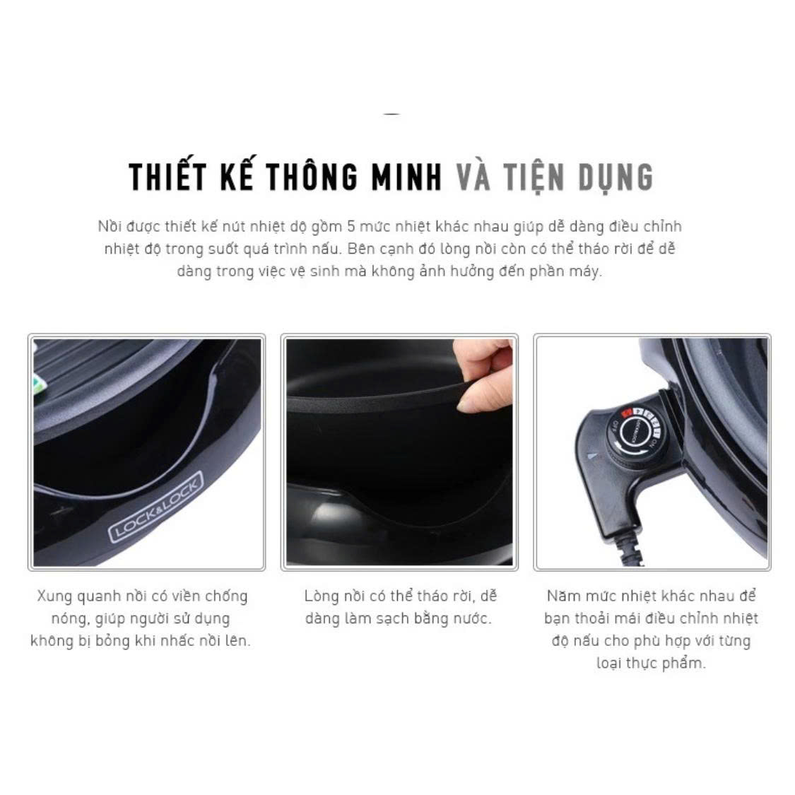 Nồi điện đa năng Lock&Lock EJP331BLK ứng dụng công nghệ hiện đại, mang lại khả năng nấu nướng linh hoạt, giúp bạn không chỉ nấu lẩu mà còn sử dụng để chế biến các món chiên, chưng, xào,hấp vô cùng tiện lợi. Nồi có thang nhiệt độ được phân chia theo mức tăng dần và được trang bị nút điều khiển tiện dụng giúp bạn dễ dảng thao tác và theo dõi quá trình nấu nướng