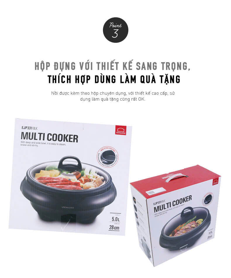 nồi điện đa năng Lock&Lock EJP331BLK có dung tích 5 lít, chứa được nhiều thức ăn, mâm nhiệt lớn có thể đặt được nhiệt độ từ 0 – 230 độ C cho bạn thời gian nấu nướng nhanh chóng, giúp tiết kiệm thời gian cho các bà nội trợ