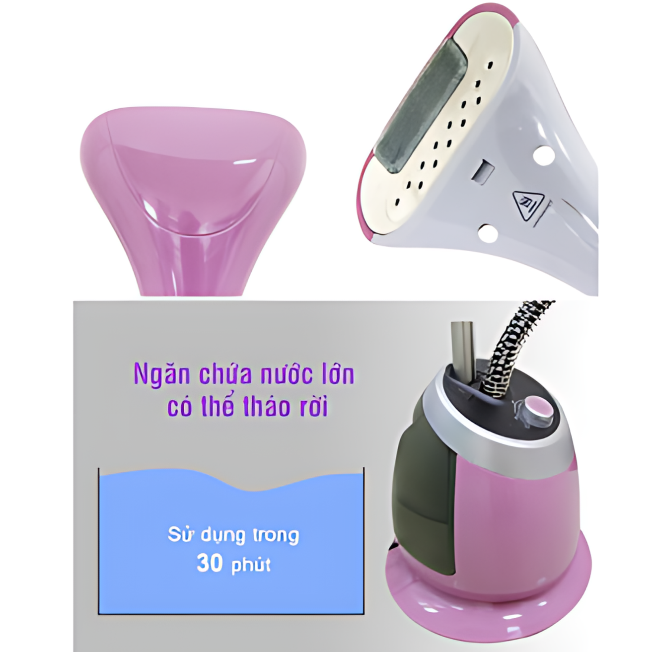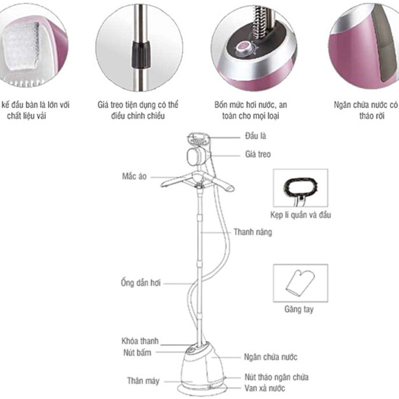 Thiết bị được làm bằng chất liệu nhựa ABS cao cấp, có độ bền cao với thiết kế đầu bàn là lớn và làm bằng chất liệu vải mềm mịn. Cùng với giá treo tiện dụng làm bằng thép không gỉ cứng cáp và có thể điều chỉnh chiều cao dễ dàng, thuận tiện cho người dùng.