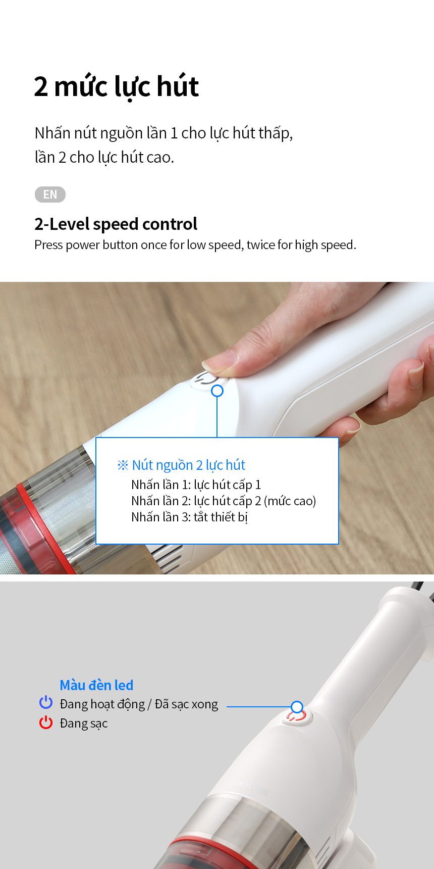 – 2 MỨC LỰC HÚT: Nhấn nút nguồn một lần cho lực hút thấp, hai lần cho lực hút cao