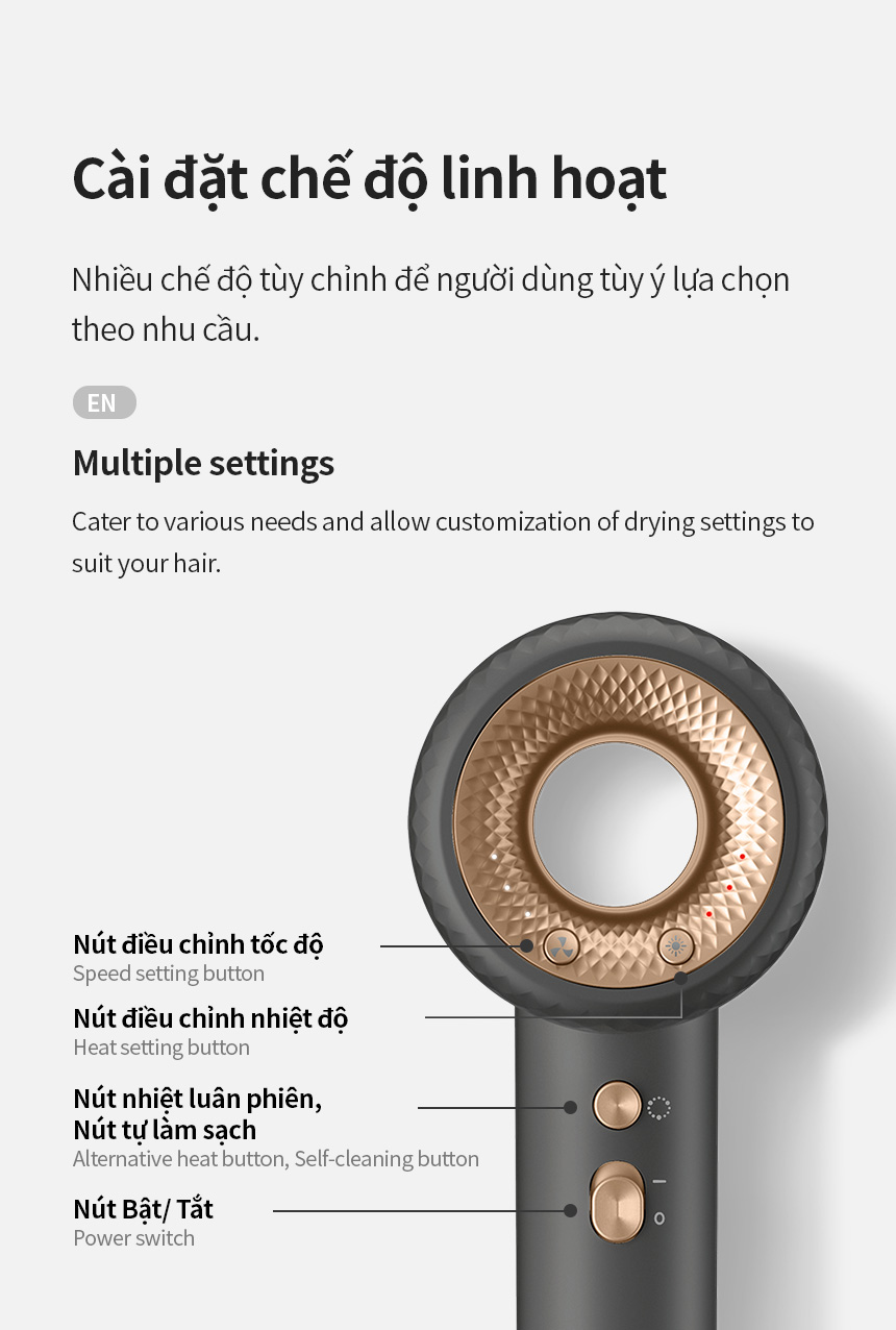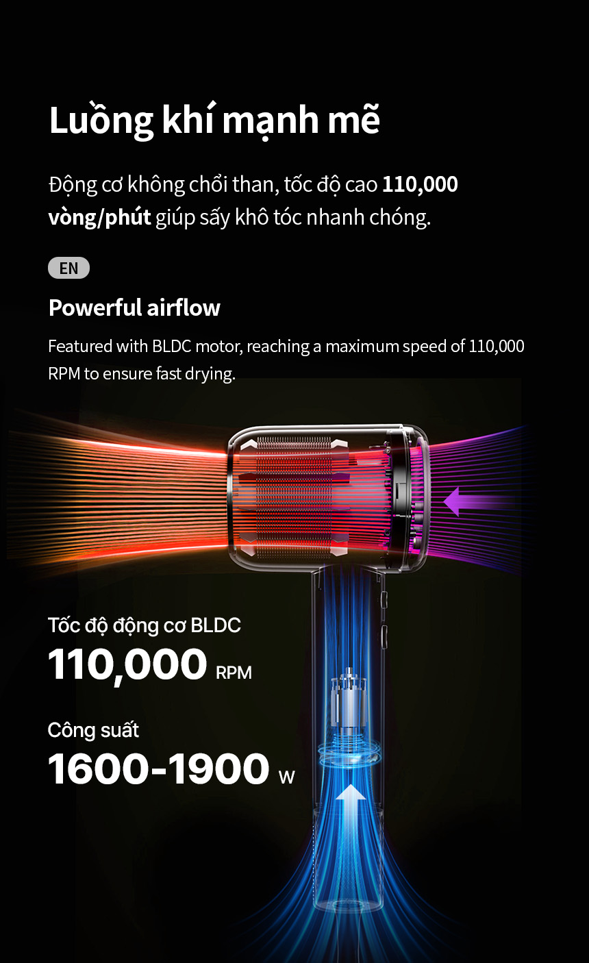 LUỒNG KHÍ MẠNH MẼ: Động cơ không chổi than , tốc độ cao 110,000 vòng/phút giúp sấy khô tóc nhanh chóng.