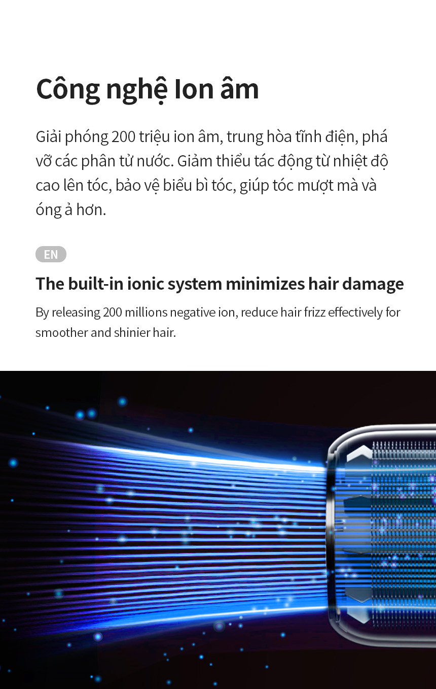 CÔNG NGHỆ ION ÂM: Giải phóng 200 triệu ion âm, trung hòa tĩnh điện, phá vỡ các phân tử nước. Giảm thiểu tác động từ nhiệt độ cao lên tóc, bảo vệ biểu bì tóc, giúp tóc mượt mà và óng ả hơn.