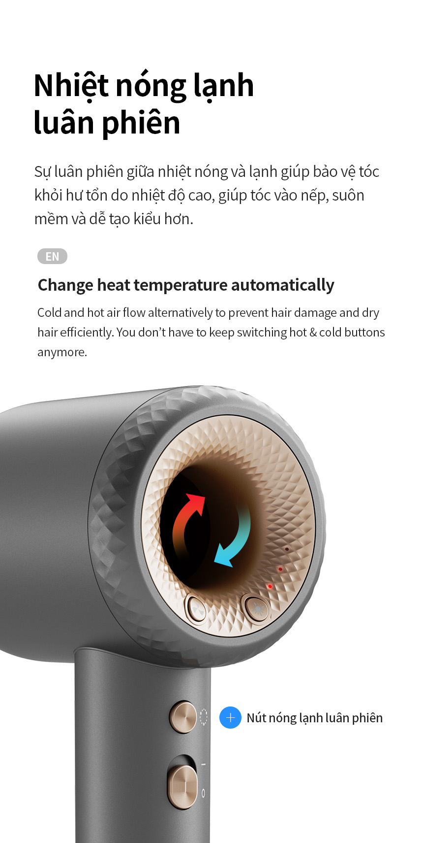NÚT NHIỆT NÓNG LẠNH LUÂN PHIÊN: Sự luân phiên giữa nhiệt nóng và lạnh giúp bảo vệ tóc khỏi hư tổn do nhiệt độ cao, giúp tóc vào nếp, suôn mềm và dễ tạo kiểu hơn