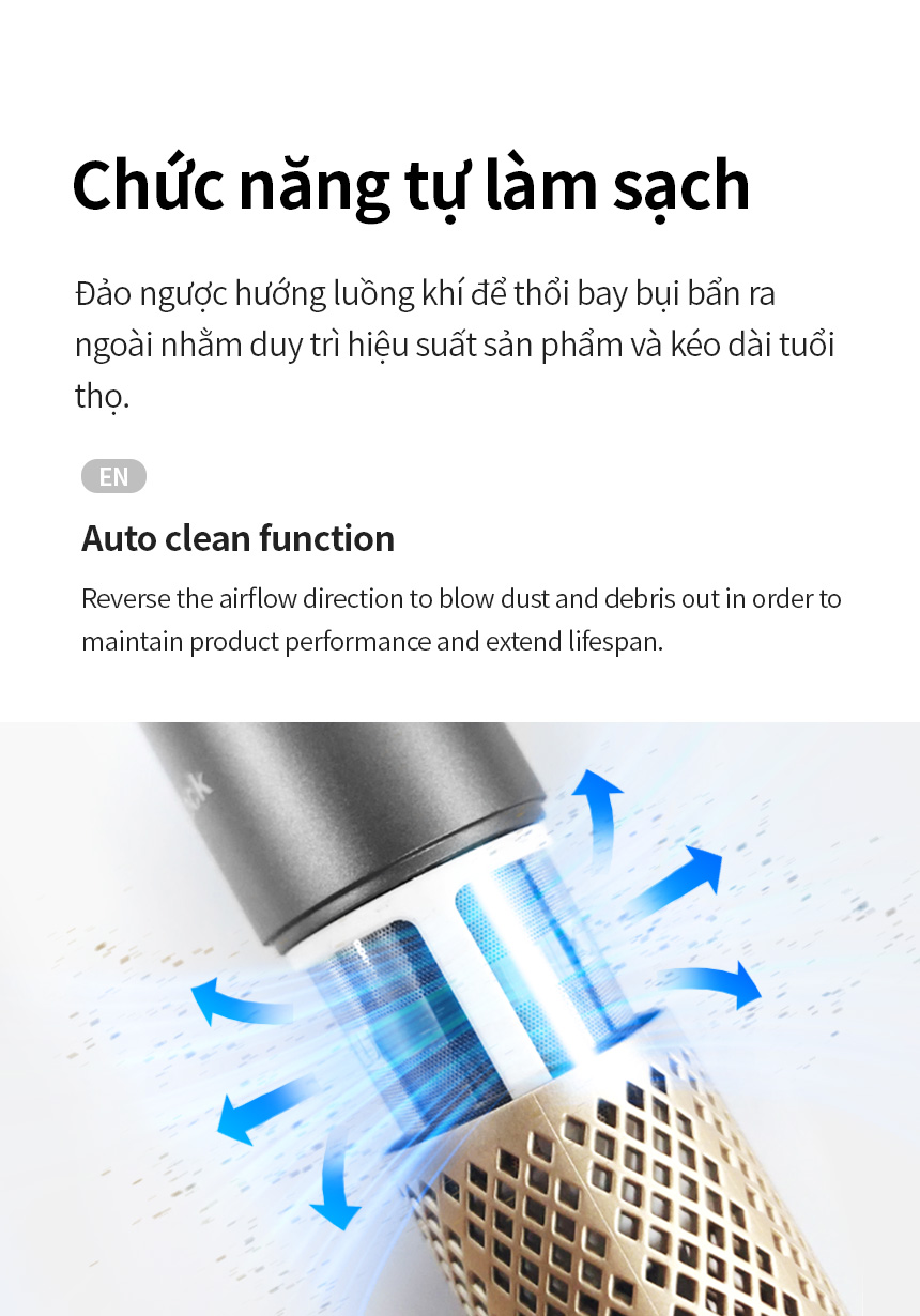 CHỨC NĂNG TỰ LÀM SẠCH: Đảo ngược hướng luồng khí để thổi bay bụi bẩn ra ngoài nhằm duy trì hiệu suất sản phẩm và kéo dài tuổi thọ.