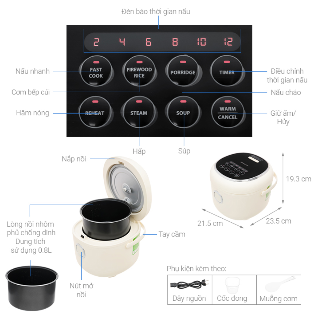 Dung tích nhỏ gọn: dung tích gạo 0.8 L, hoàn hảo cho căn bếp nhỏ