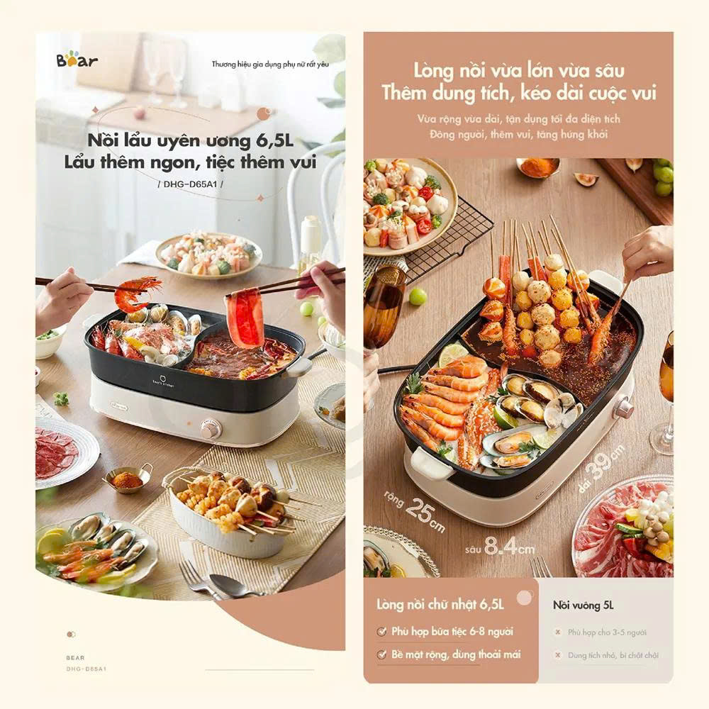 Nổi Lẩu 2 Ngăn Bear DHG-D65A1 dung tích 6.5L công suất 1600W