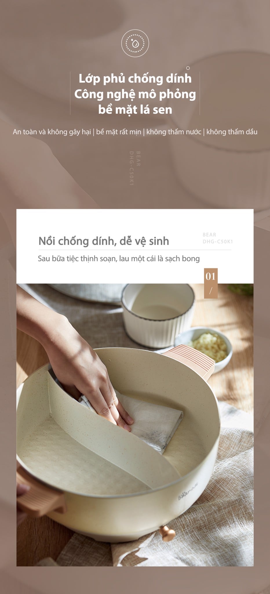 Sau khi sử dụng, bạn cần vệ sinh sạch sẽ Nồi lẩu điện 2 ngăn Uyên ương Bear DHG-C50K1 để đảm bảo an toàn cho sức khỏe của gia đình. Hãy dùng bàn chải và nước sạch để làm sạch nồi lẩu, đặc biệt là các khe và ngăn chứa nước.