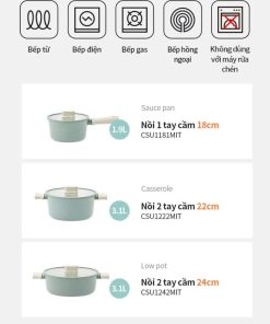 – Nồi 2 tay cầm (CSU1222MIT) : Đường kính: 22cm, Cao: 10.3cm, Dung tích: 3.1L