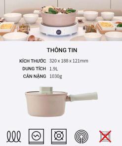 – Nấu chín chỉ 2 phút với bếp từ. Mặt đáy phủ kín ion nhiễm từ giúp hấp thụ nhiệt tốt